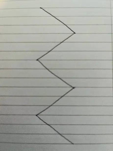 Place your pen on a piece of paper and draw a line about 3 centimetres long diagonally to the right, towards you. Then, keeping your pen where it is draw another line about 3 centimetres long diagonally to the left towards you. Keeping your pen on the paper repeat these actions a few times more until you end up with something like this: